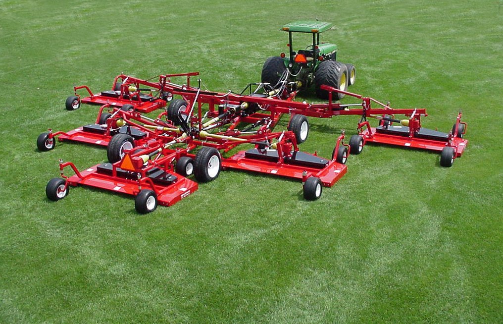 requirementsare all built in features of the Progressive Tri-Deck Rotary Finishing Mower. With 3 independent floating decks mounted to a main transport frame, the Tri-Deck Mower will follow most ground conditions encounteredduringthe mowingof parks, industrialsites, school yards, large recreation areas, and golf courses, without scalping.